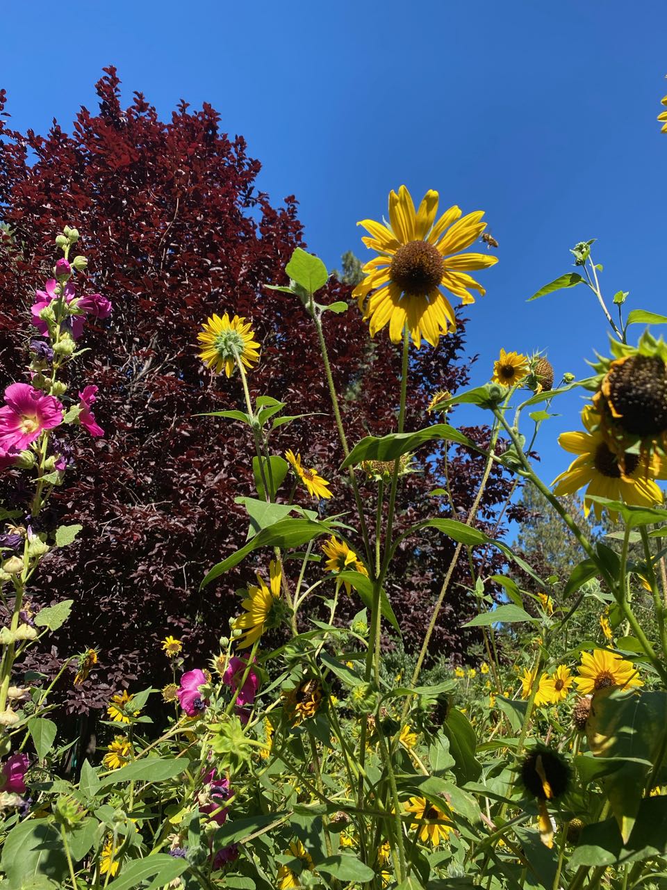 This year, things did get a bit out of hand. You have to duck to make your way out from our front door to the gate. The tunnel of sunflowers, asters, and hollyhocks buzzes with bees in the full sun. If lucky, a hummingbird might eye you from a perch a hand’s grasp away. Wes suggests in his gentle way that maybe next year, a little more clearance?