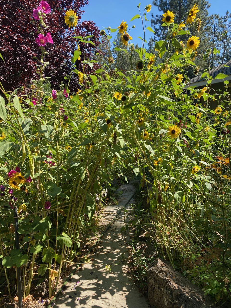 “Did you plant all those sunflowers?,” my niece Becca asked during her brief overnight stay on a cross-country trek with her best girlfriend. I took them on a tangly tour–a chance to feel like a very small Alice in Wonderland within the layered flower forest, where such a density of plant life also retains moisture in these dry times.