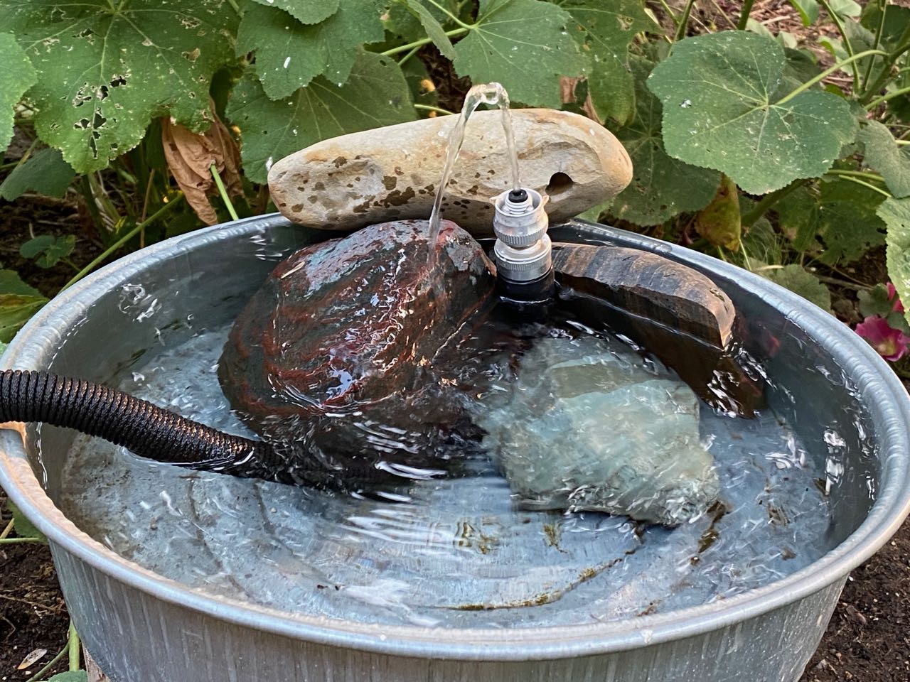 I’m also lulled by Wes’s creative water feature–pairing his love of collecting rocks with a practical metal oil pan (never used for changing oil) and a well placed hose like a fountain. Later on this same day (continuing the post) a Wilson’s warbler flew in to sip and bathe from the overflow below as Wes and I ate our dinner close by and birds came close in the evening light. The little bright yellow bird with a snazzy black cap signals a turn of seasons from summer to fall, restlessness, and the astonishing ritual of migration. Our haven is giving him a boost of water, cover, and plentiful insects on a journey as far south as Panama.
