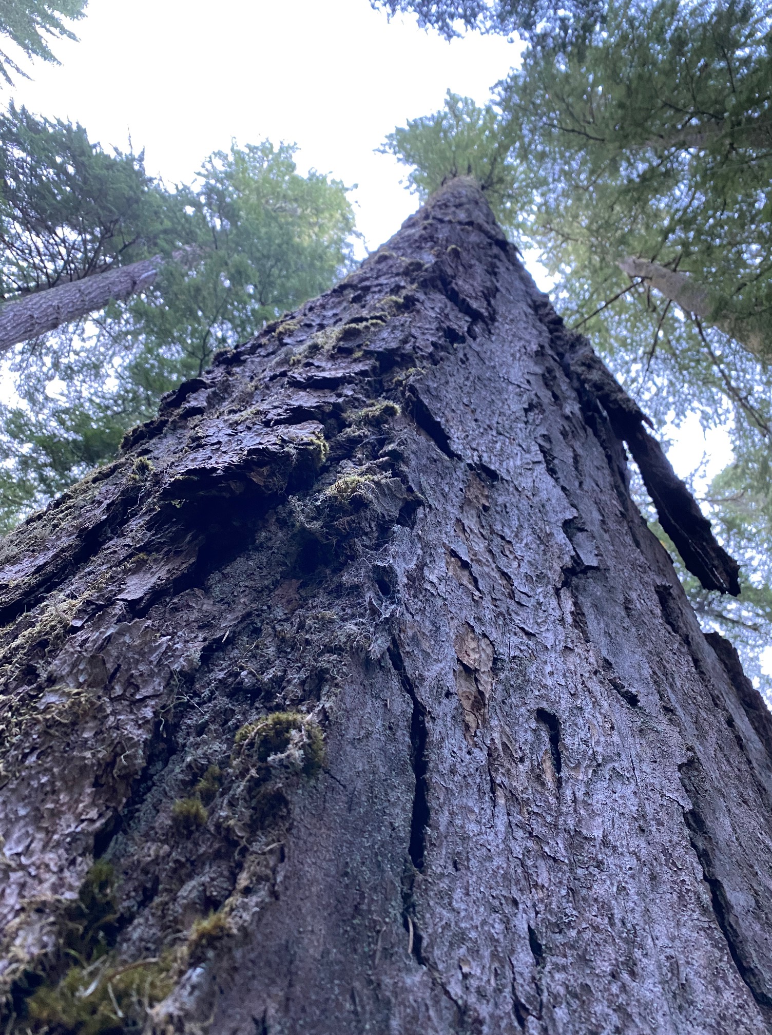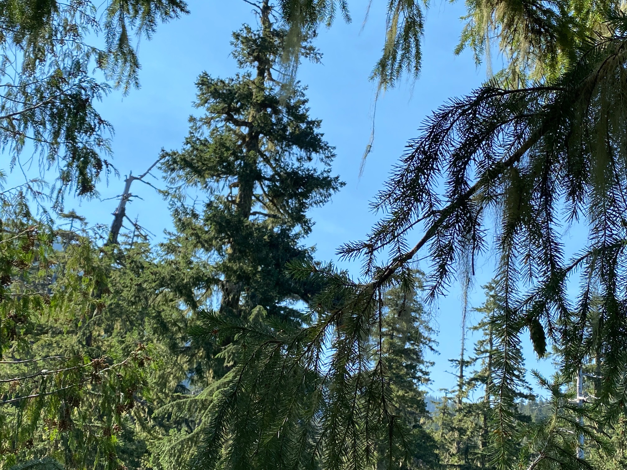 Waiting for Nina, I survey the forest from this highest point. Drinking in the full cup of blue sky, I am one with fellow trees narrowing, leaning, tipping, angling, and gathering sunlight to photosynthesize for energy. In the process? The trees are scrubbing the overladen atmosphere of carbon dioxide. The bigger they are, the more carbon they store within their vast trunks and roots. When they die, they continue to store carbon and nurture biodiversity.