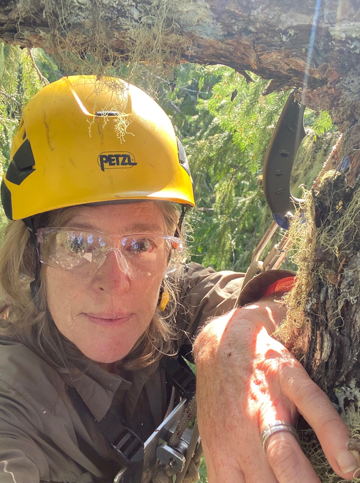Slight skip of a heartbeat. Nina told me this might happen. Deep breath. All I have to do is reach down and press the rope back in. But nothing is easy this high up. I can’t quite finagle the move. Go slow, I think. Remember, the forest is breathing all around me and my oxygen is their oxygen. I’m held in the arms of this Douglas-fir so vibrant and witnessing.