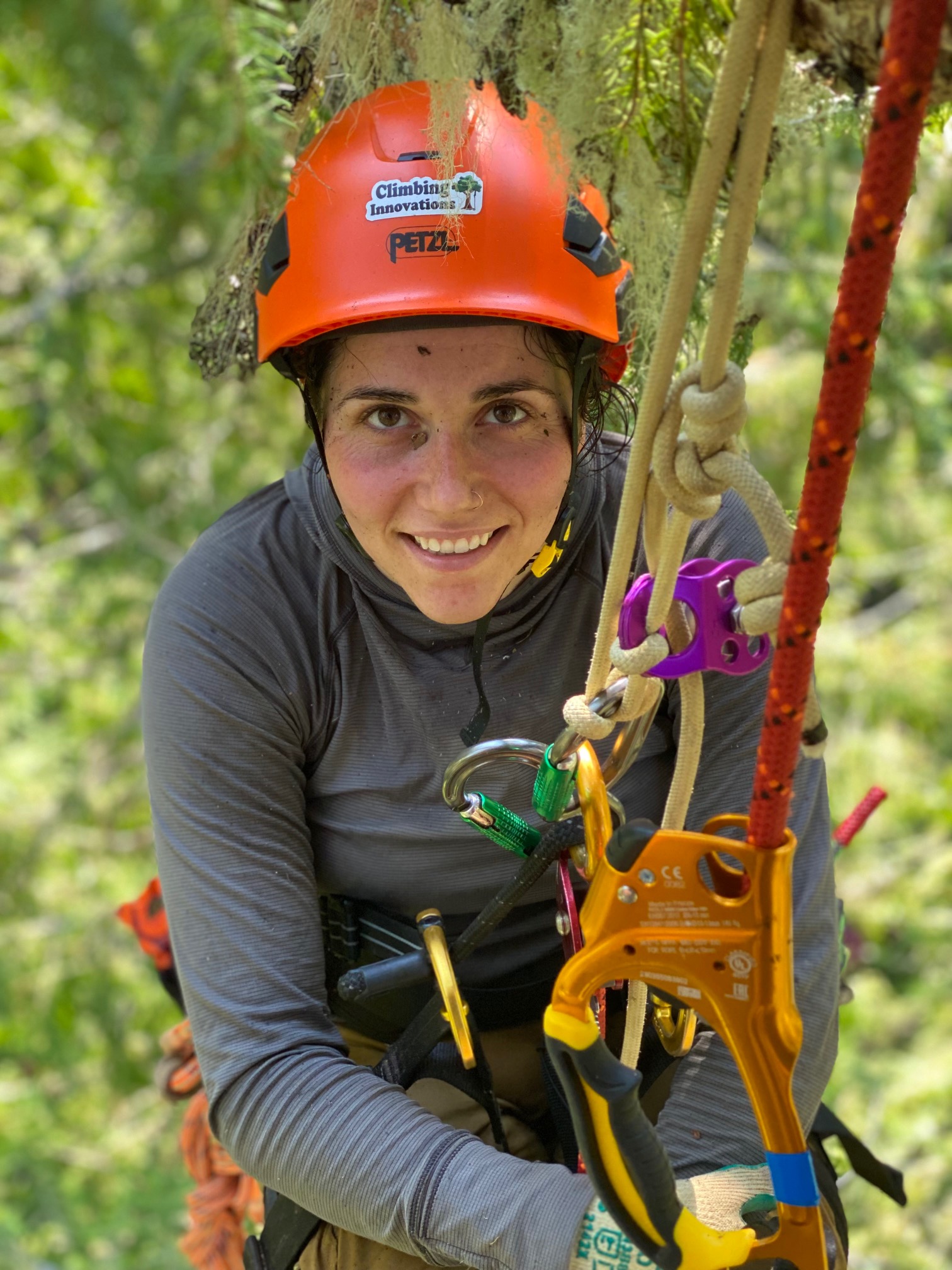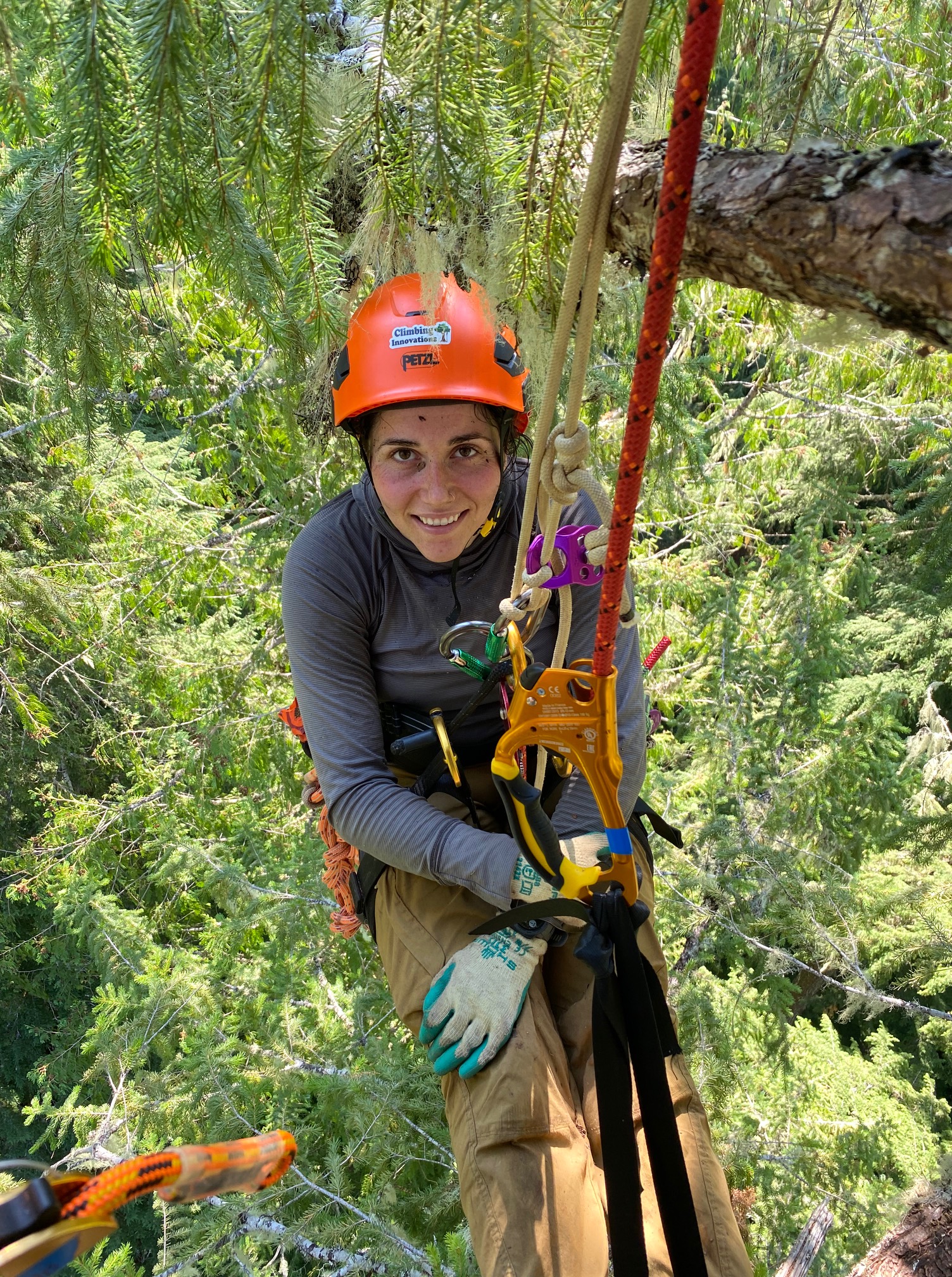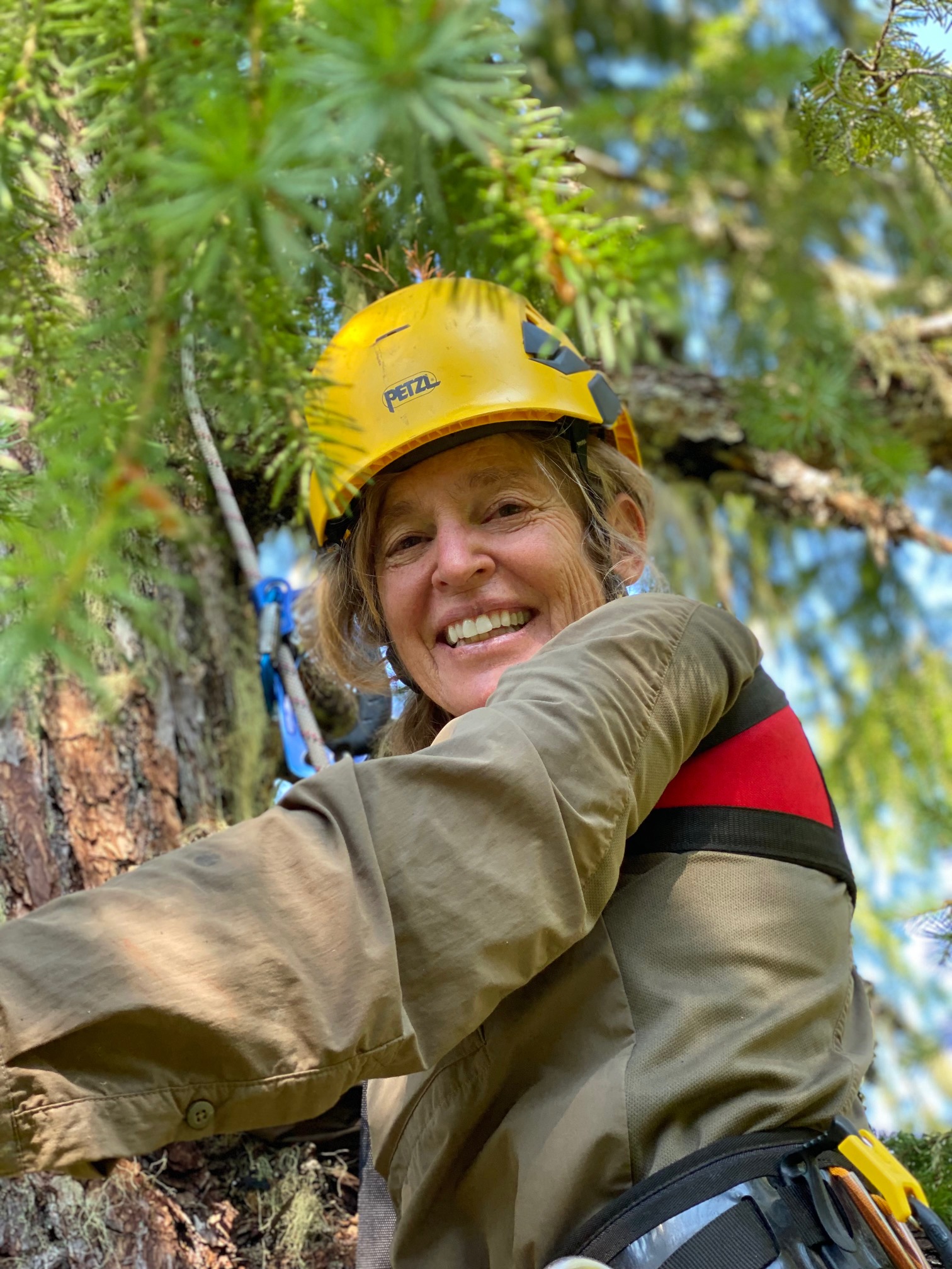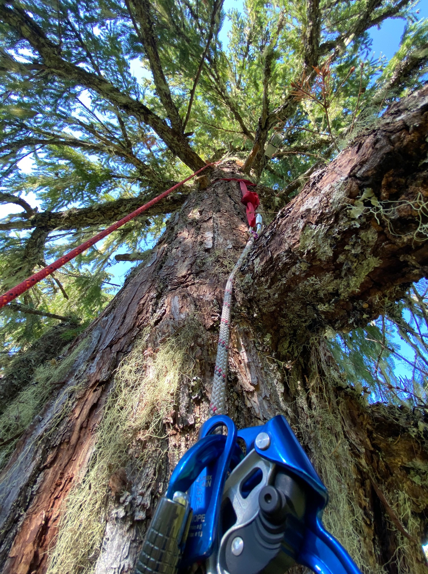The rhythm is tricky at first and I’m spinning in the air. Gradually, I take bigger steps as I push the hand ascender up the single rope. About twenty feet off the ground, I pause to take in the enormity of tree trunks in all directions. Close by is a western red cedar with shaggy bark and skirted in flexing limbs bearing needles like pressed ferns. In this moment of hover, I imagine what it would be to see like a rufous hummingbird suspended on sprint-fast wings above rhododendron, vine maple, and huckleberry.