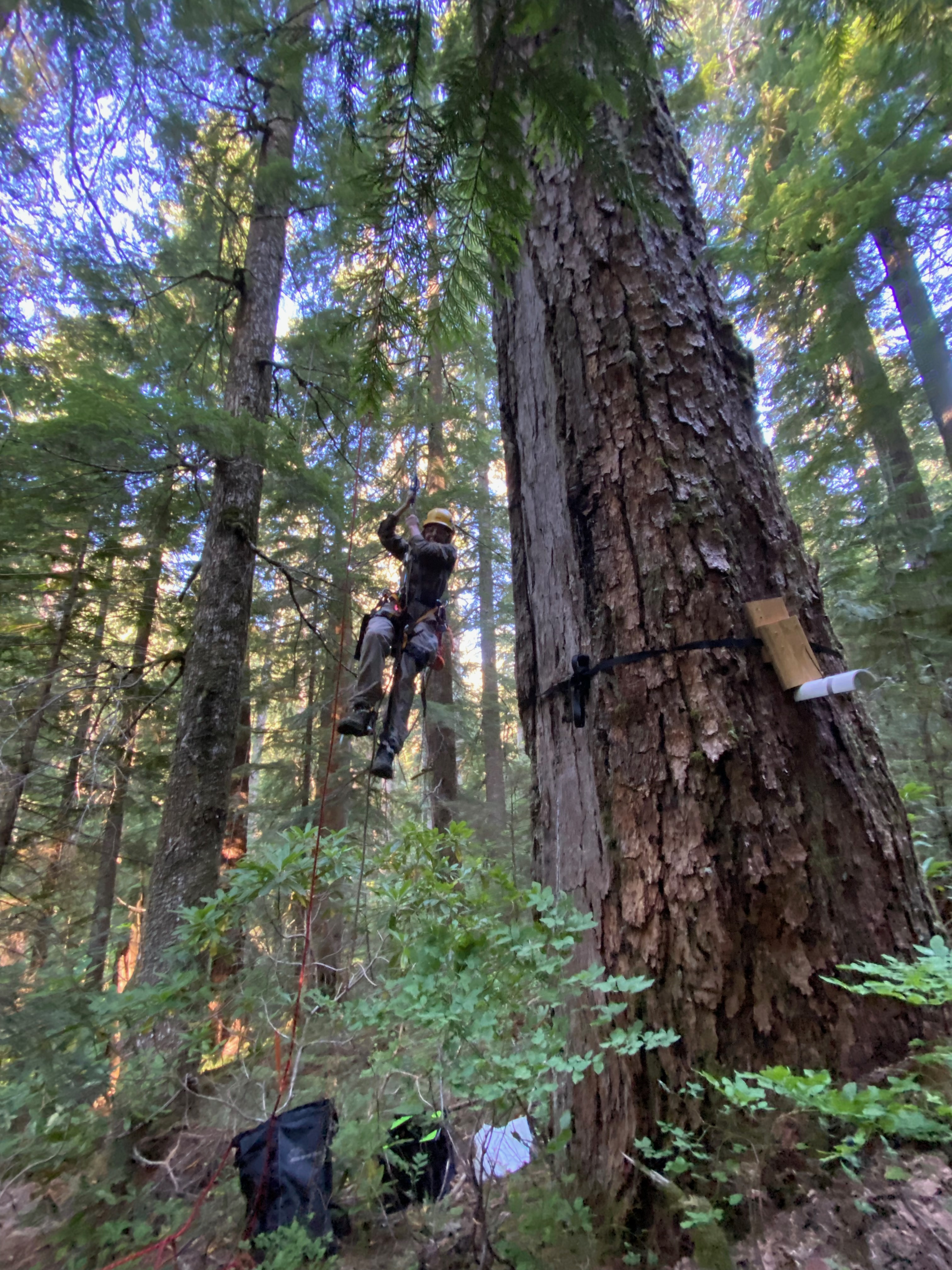 The name of the Douglas-fir is Traverse, as anointed this summer by Nina Ferrari, the youthful bird researcher from Oregon State University, and my climbing teacher. With us is Nina’s advisor for her graduate project, Dr. Matthew (Matt) Betts. He’s taking photos from below and exploring the mossy nurse logs and other riches of the understory.