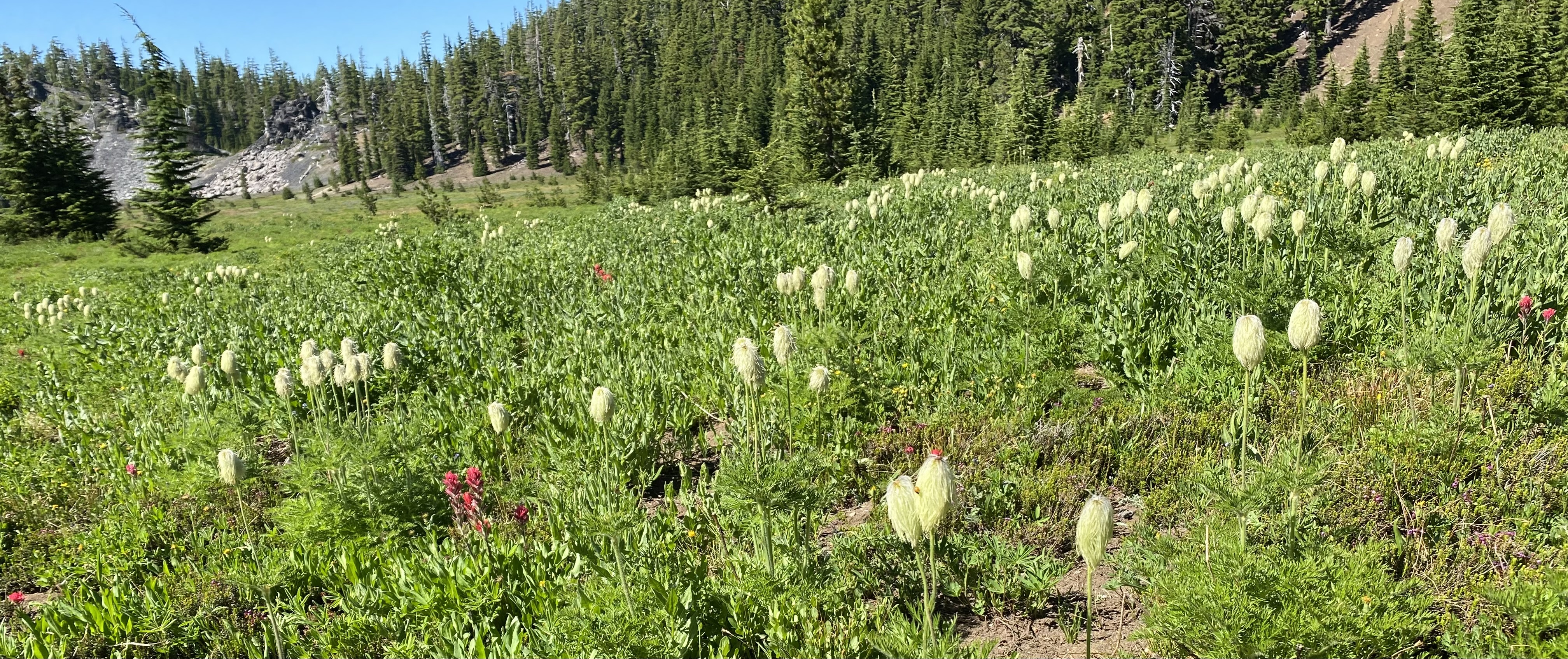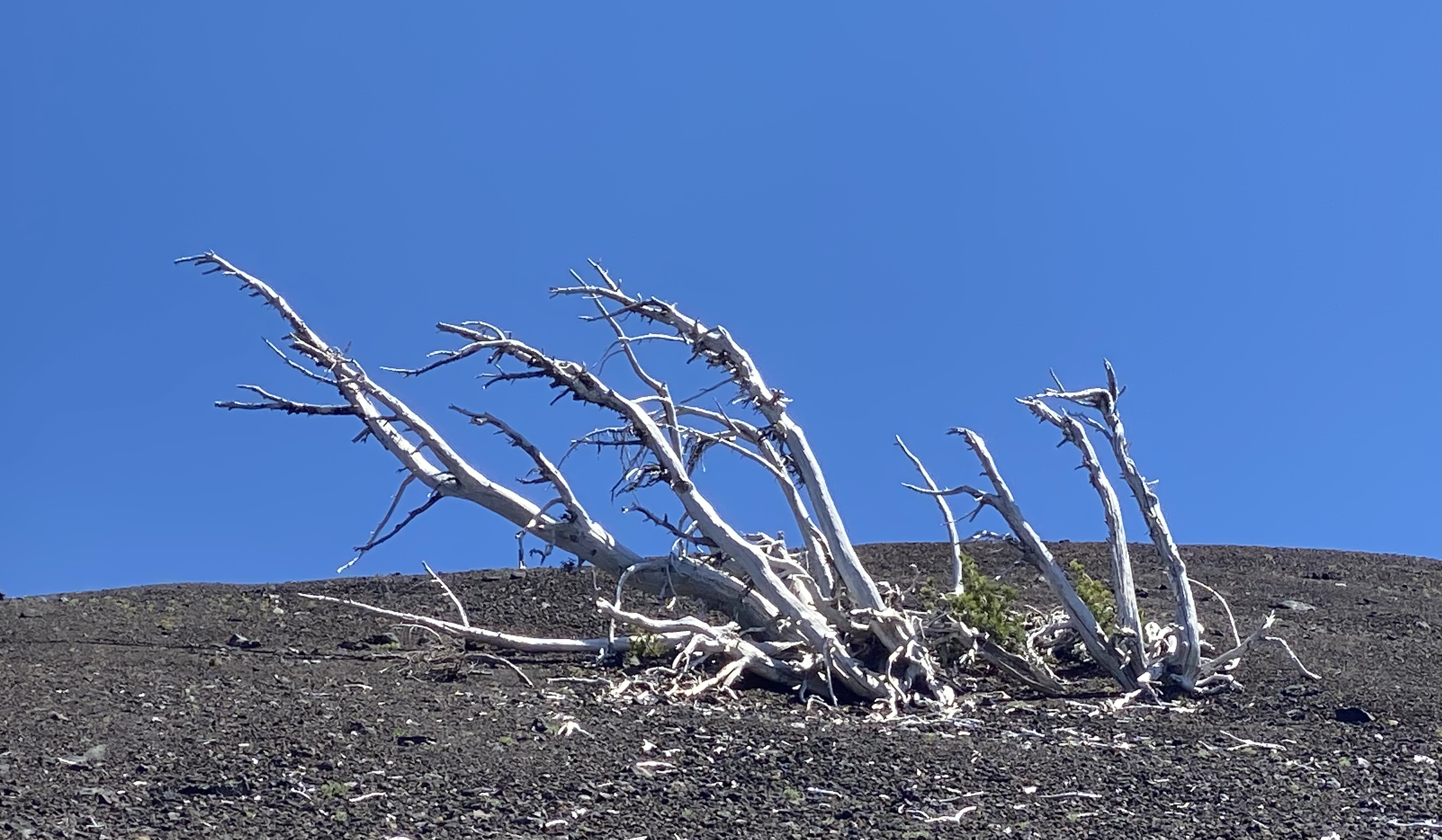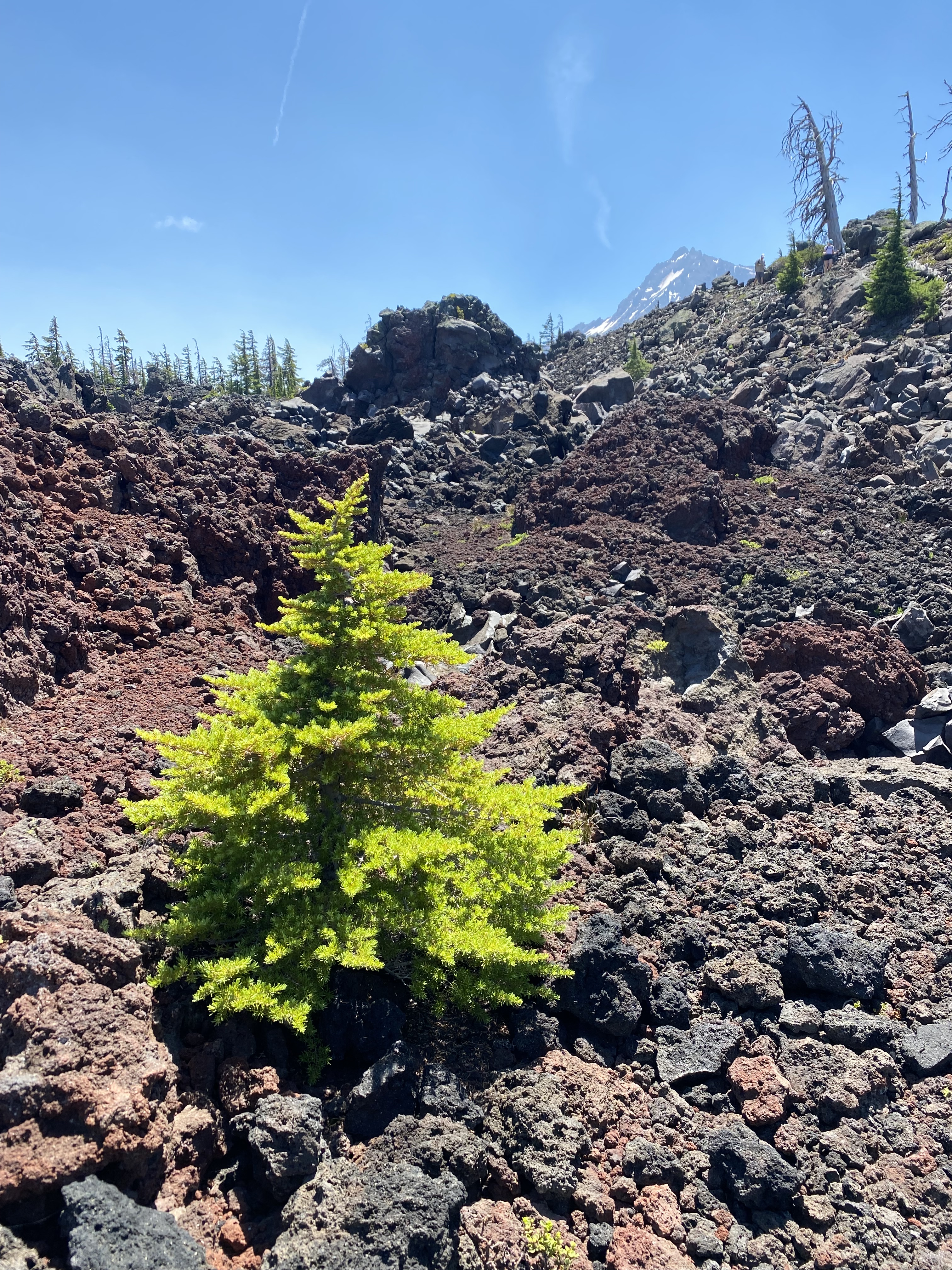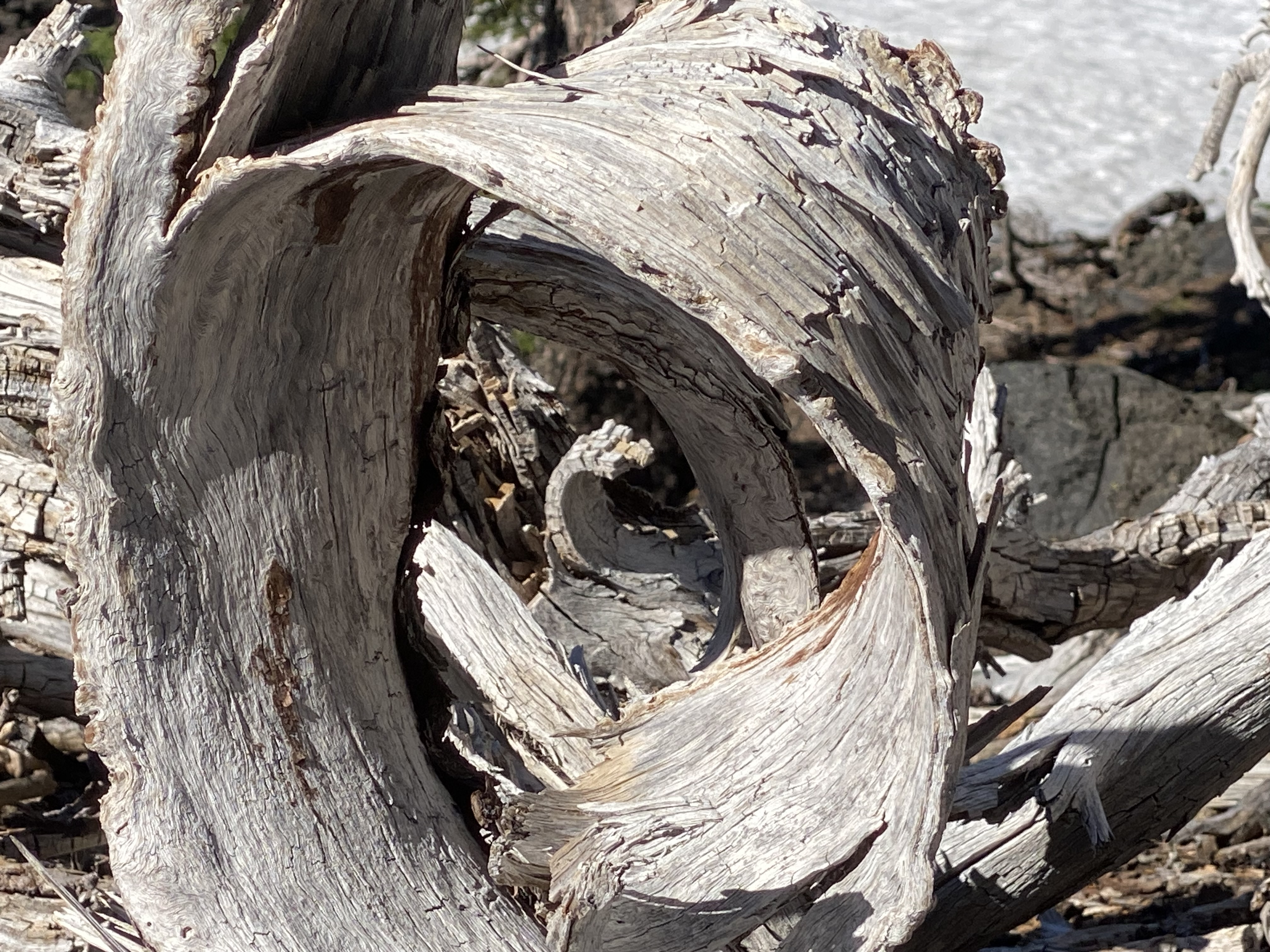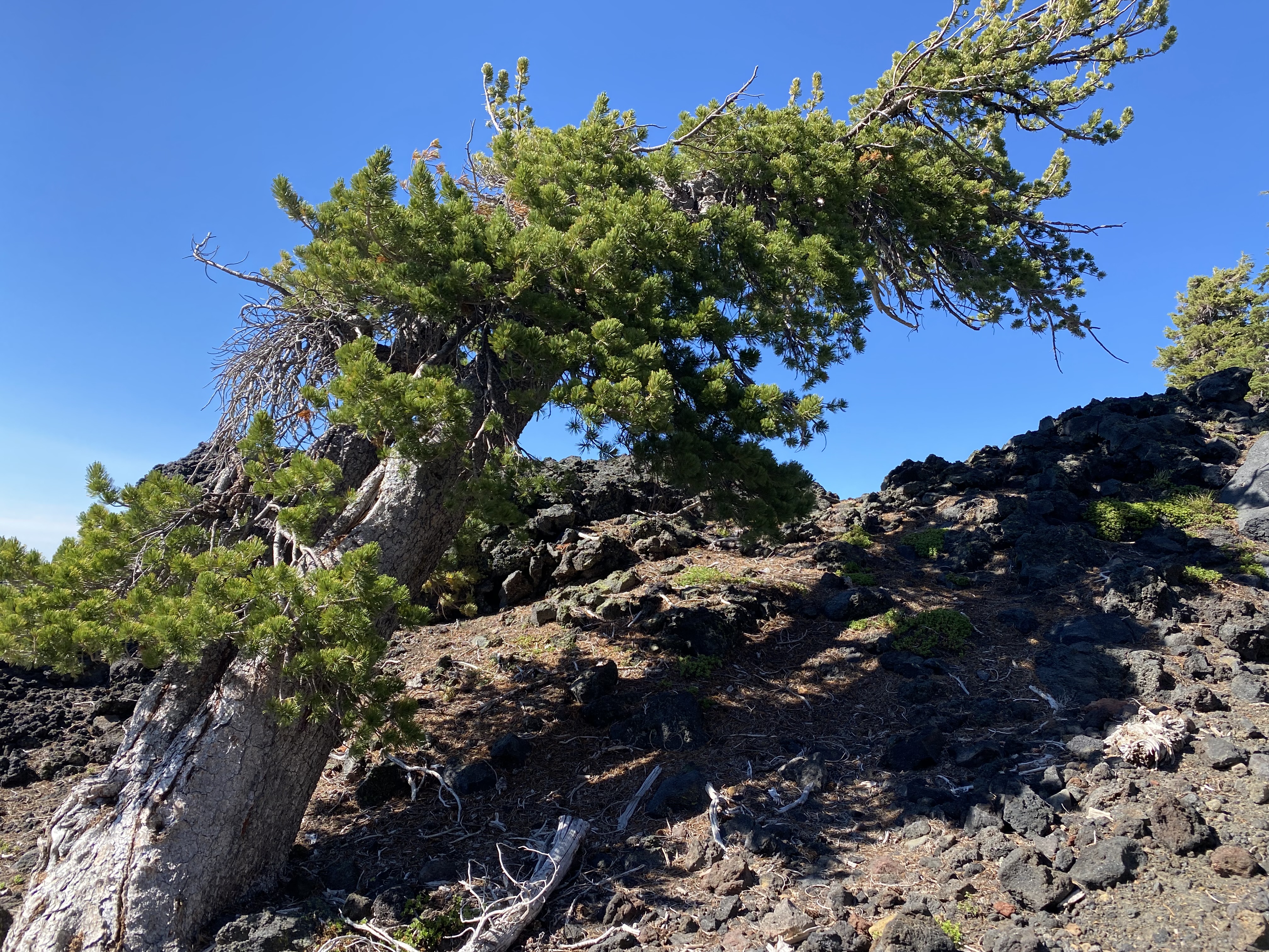 Endangered ancient whitebark pine leans uphill close by the Pacific Crest Trail north of North Sister. This tree is a rare survivor, escaping deadly blister rust that has decimated so many. Keystone. Entwined. Headwaters.