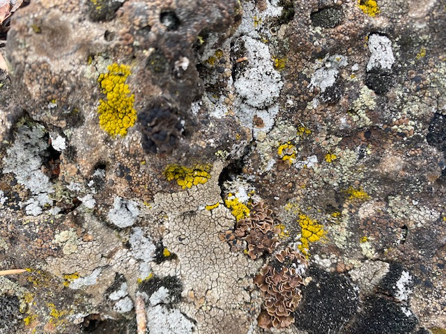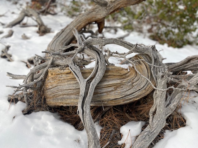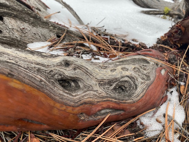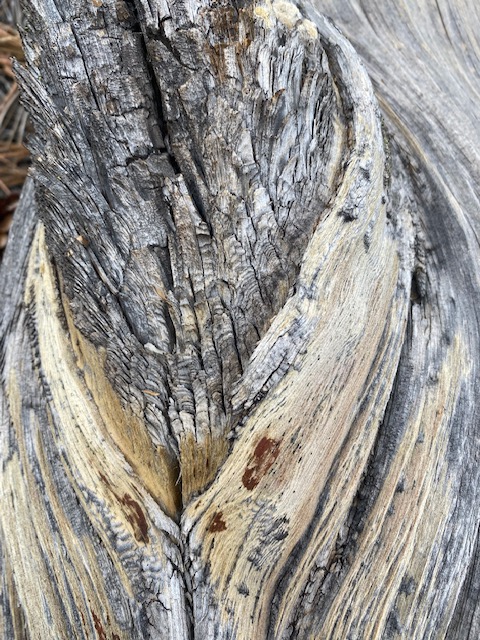 I am in the slow-down mode after a rush to meet a writing deadline and heeding a cranky hamstring. I bring my phone on the saunter only as a camera to focus on small wonders. These woods I’ve come to know are not dramatic at first glance. Almost all the trees are smallish ponderosas, except for a sprinkle of junipers and two Scouler’s willows where scrub jays tend to converse. The driftwood stumps tell the story of logging maybe a century ago.