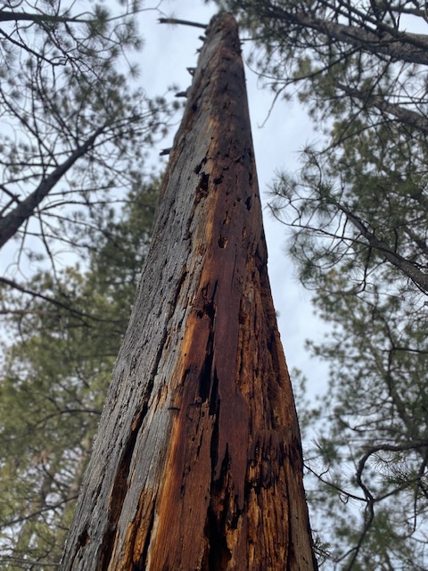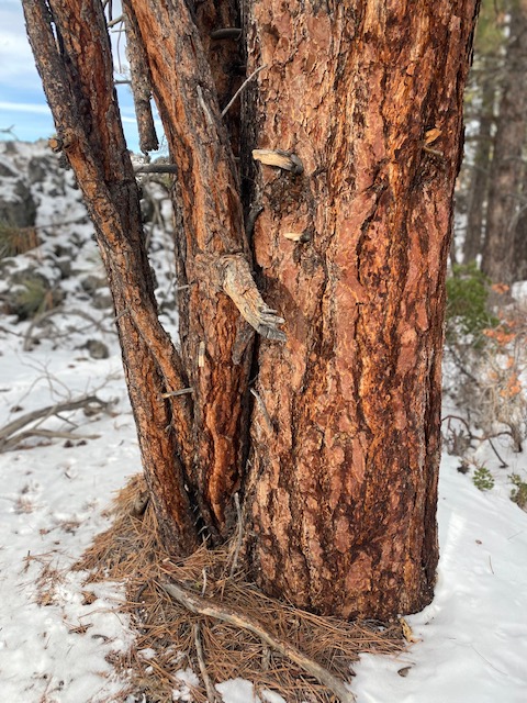 Yet, here’s what I love. Since that time, this sliver of national forest has slipped by foresters intent on imposing order upon all that is twisted, bent, fallen, clustered, mistletoed, dying, or dead. The forest re-wilds in her way–proving that yes, six ponderosas can grow in one embrace. The seeds likely sprouted from a squirrel cache.