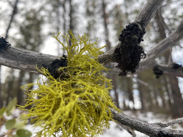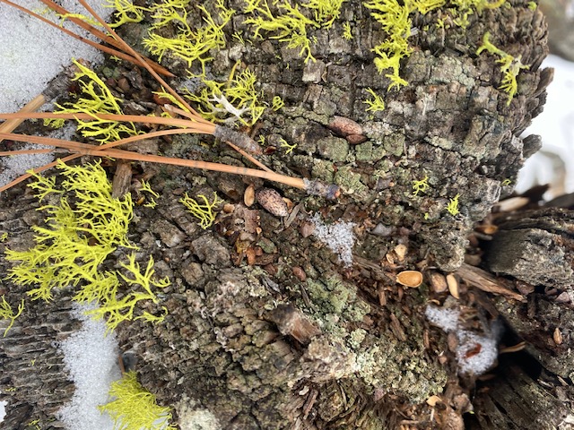 How to come closer to the stars? I stoop down low. Take off my mittens. Brush my fingers across the fluorescent-green lichen like sea coral. I notice the seeds and shells of pine cones on the driftwood-gray stump, the place a squirrel dined with ears alert to danger.