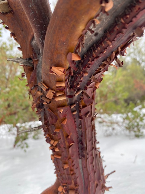 I hear the hints of”gladness” in the breathing of trees. On this walk, I’m also drawn to the interplay of living and dead, like the manzanita intertwined in two-tone bark the colors of blood and bone. Melancholy drifts into my consciousness. Perhaps it’s the clouds settling on my soul. It’s not a sadness, more of the way I feel when listening to Eva Cassidy singing John Lennon’s “Imagine.” Her voice –at once meadowlark and sultry blues–is not forgotten decades after her death from melanoma at 33. Loss. What lives on. The singing. “You may say I’m a dreamer, but I’m not the only one…”