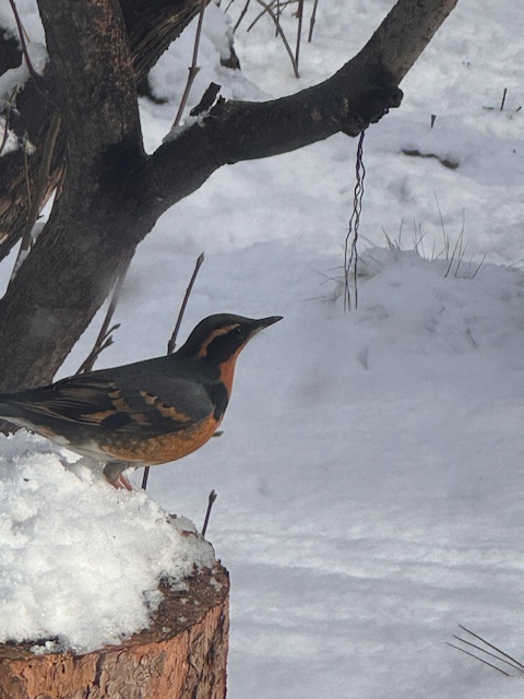 The first birds to come within that laser-sharp gaze are two Mountain Chickadees landing in the leafless lilac bearing two bird feeders. Brazen as always. These are the birds that stay put when I refill the feeders. Within five minutes, the entire gathering reconvenes in the lilac and plum tree– Lesser Goldfinches, Pygmy Nuthatches, Dark-headed Juncos, House Finches, and one Varied Thrush. The Cooper’s Hawk waits.