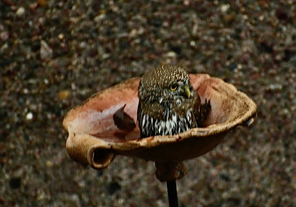 Once, Wes witnessed a Pygmy Owl snatch a junco from the ground and fly off. He told me the junco gave one last squeak. Ouch. Okay, that’s sad even as I revere all birds of prey and the adage “everything must eat.” I missed the moment, but I did take a photo of a Pygmy Owl splashing in the bird bath of a former yard in Missoula about a decade ago. (I can’t resist posting even if a bit fuzzy).