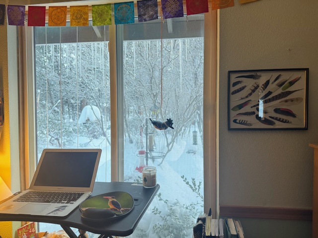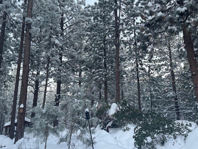 Twenty minutes pass before I sense a restlessness, a bit more head-turning, the better to see. A sense of tension. Launching, the hawk flaps across our yard–over manzanitas, ceanothus, and the last bent stalks of sunflowers and goldenrods in snow. I watch the merging of bird into spruce, the night roost for the flock of California Quail. The songbirds vaporized while my eyes tracked the star of the show.