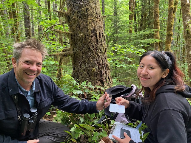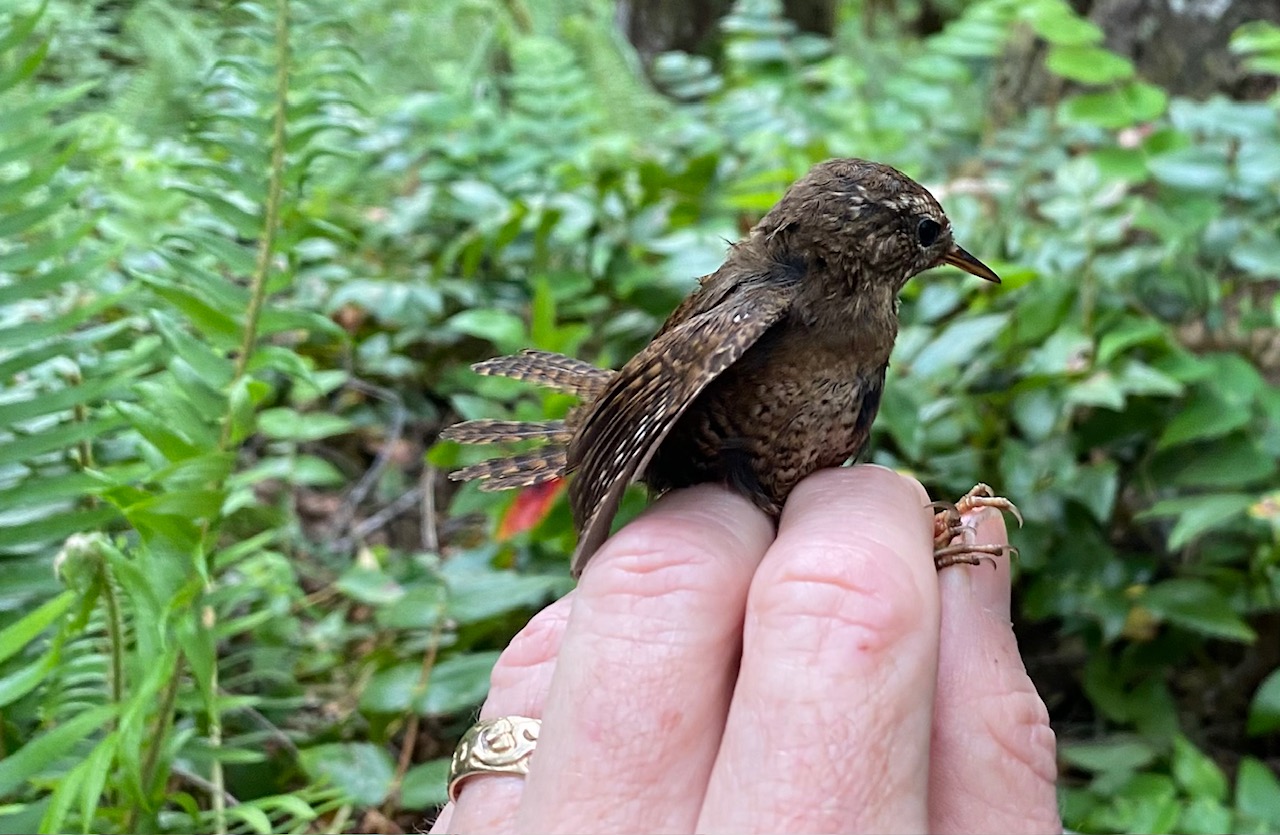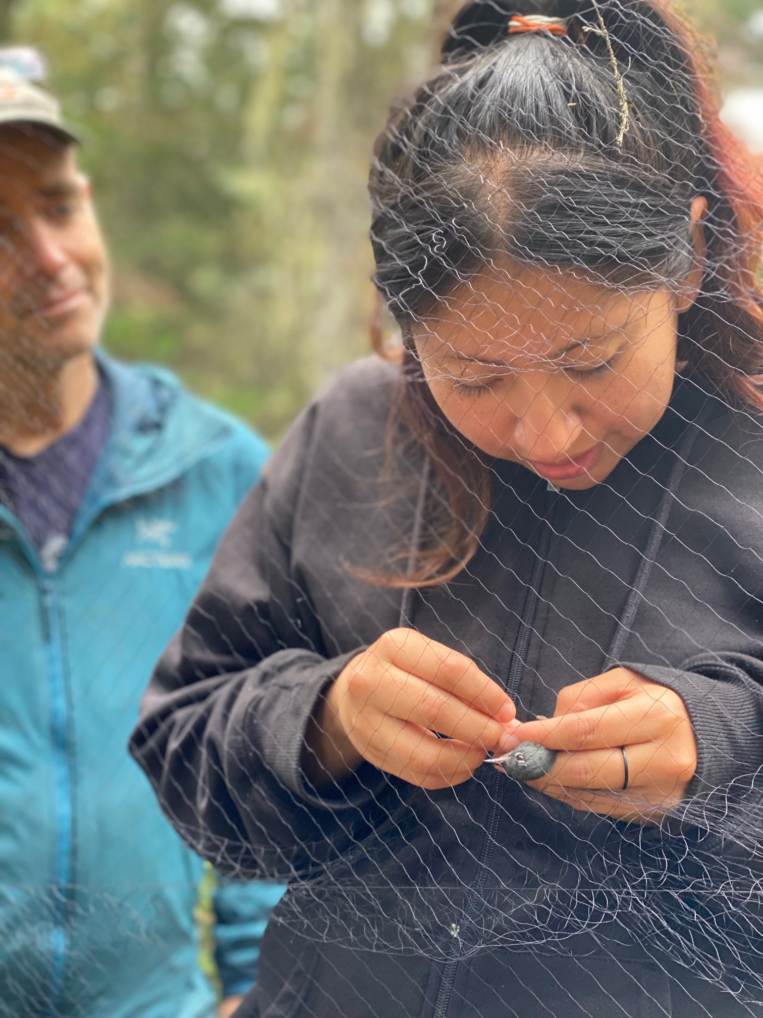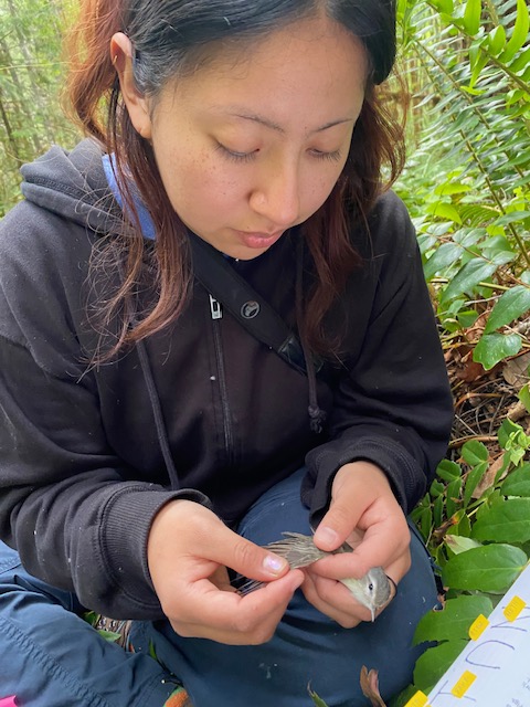 So the teams switched gears and recordings to successfully lure in two Pacific wrens, two Hammond’s flycatchers, a Swainson’s thrush, and a warbling vireo. The trained banders followed precise ethical protocols to untangle a bird from the net, place him in a cloth bag, and ferry the bird to a nearby “station” set up on the forest floor. The next steps? Measurements designed to identify age and fitness, and fitting a numbered ring on the leg.