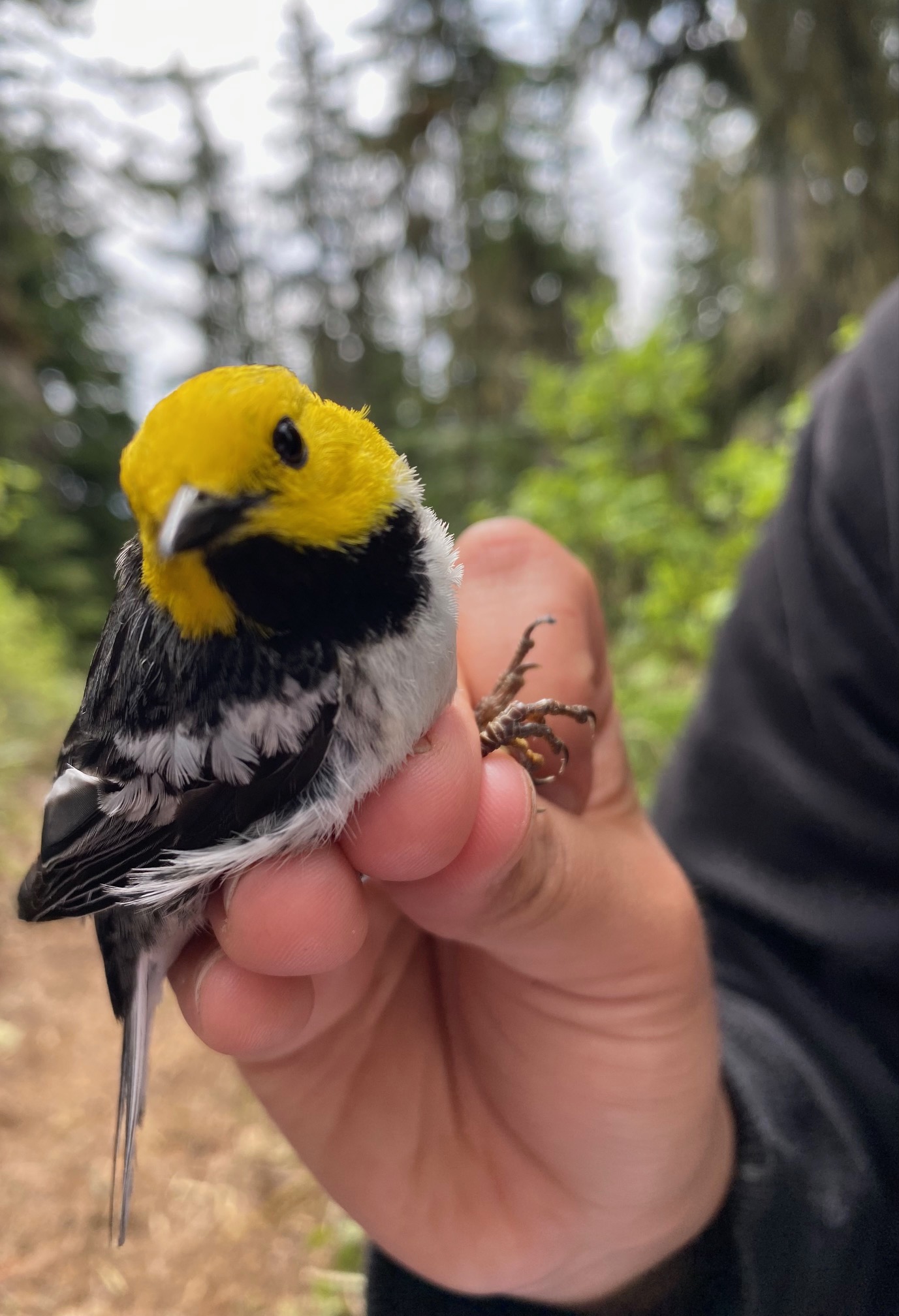 Gathering up nets and gear, four of us (Matt Johnson, Adlai Herrera, Matt Betts, and me) headed to high-elevation conifer forests, where we were fortunate to catch a Macgillivray’s warbler, as well as an Oregon junco and hermit thrush. It was there, I held the hermit warbler briefly in my hands and off he flew off like a wish.