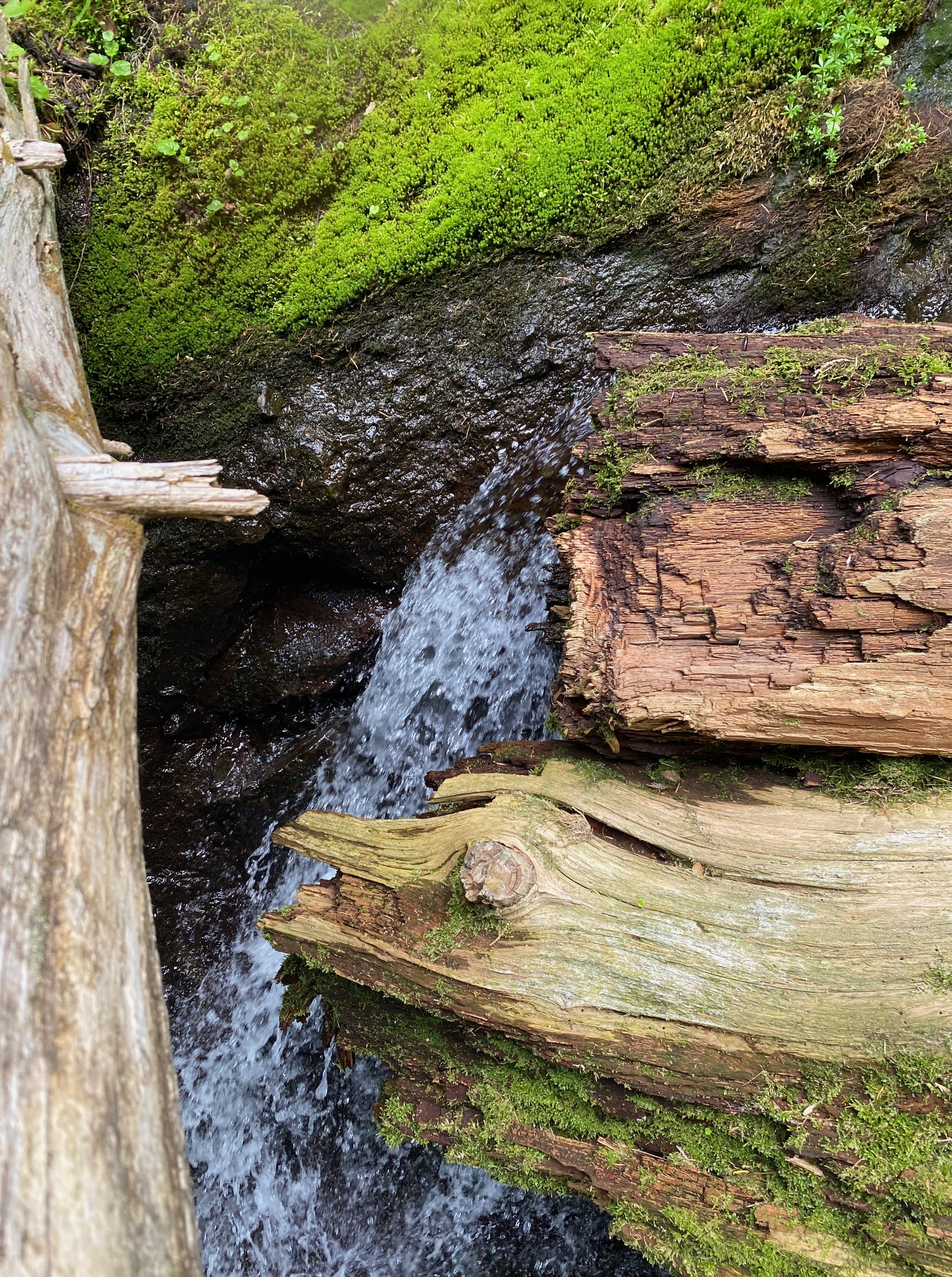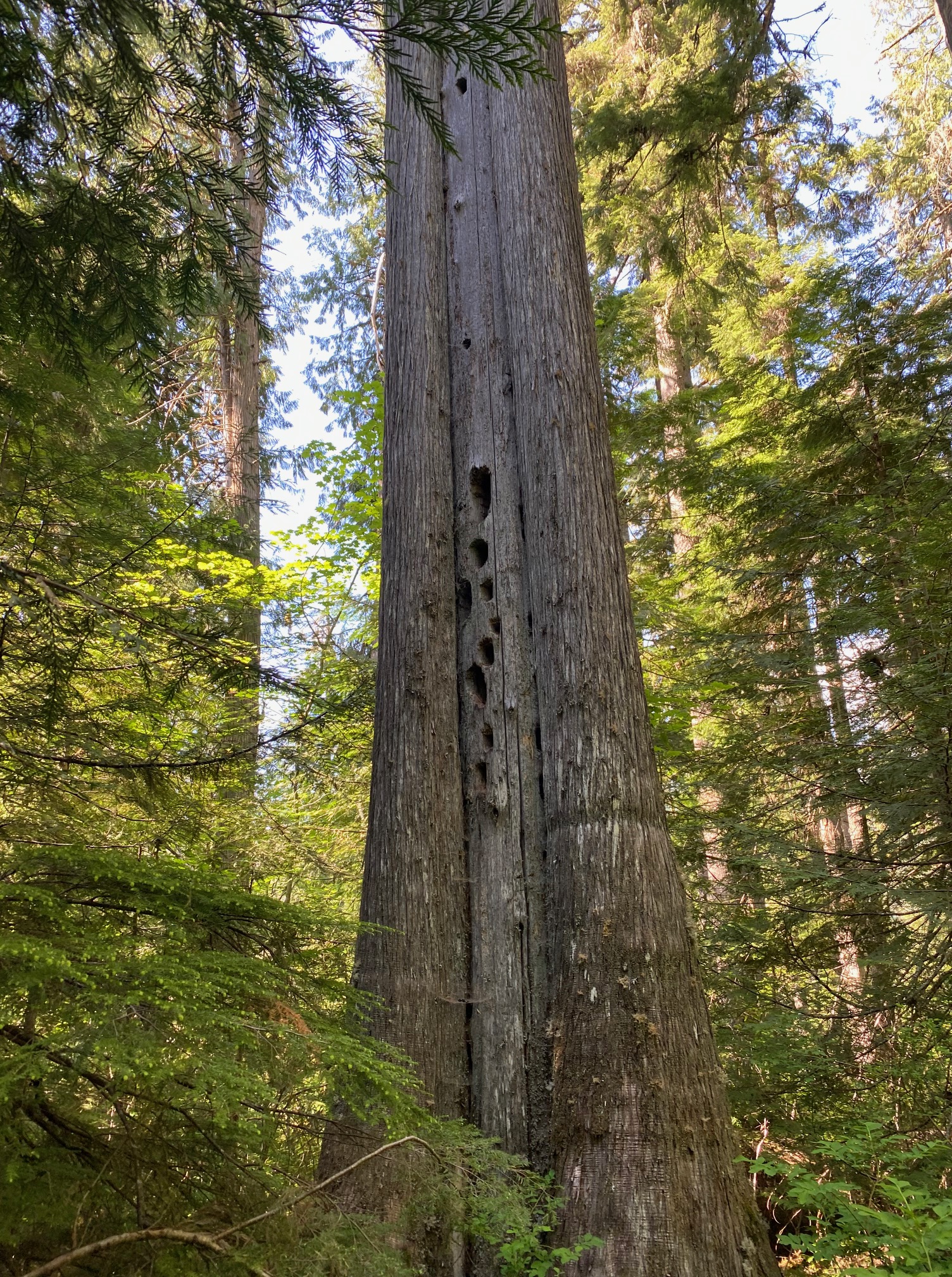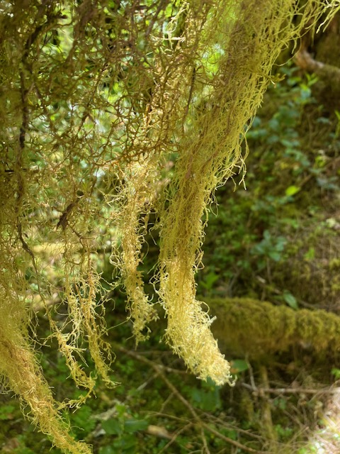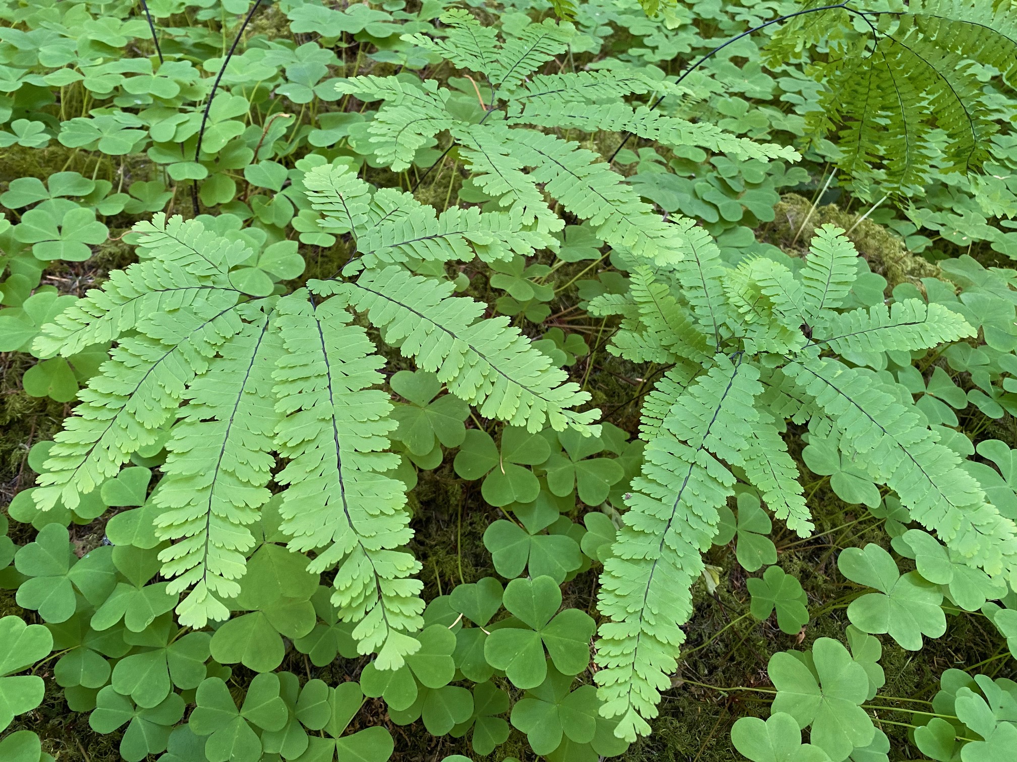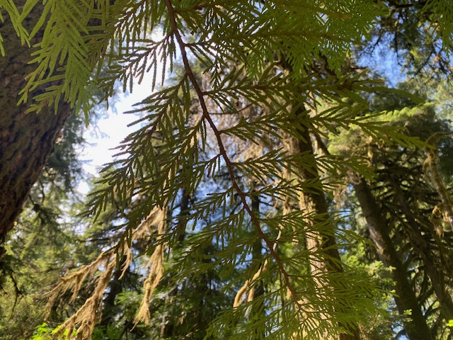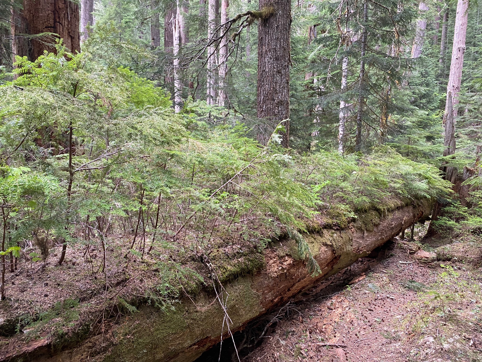 We headed first to a younger, low-elevation grove within earshot of the rushing constancy of Lookout Creek. Here, lofty, mossy maples and cottonwoods intermingled with Douglas-firs. The air felt as green as the water-loving maidenhair ferns.