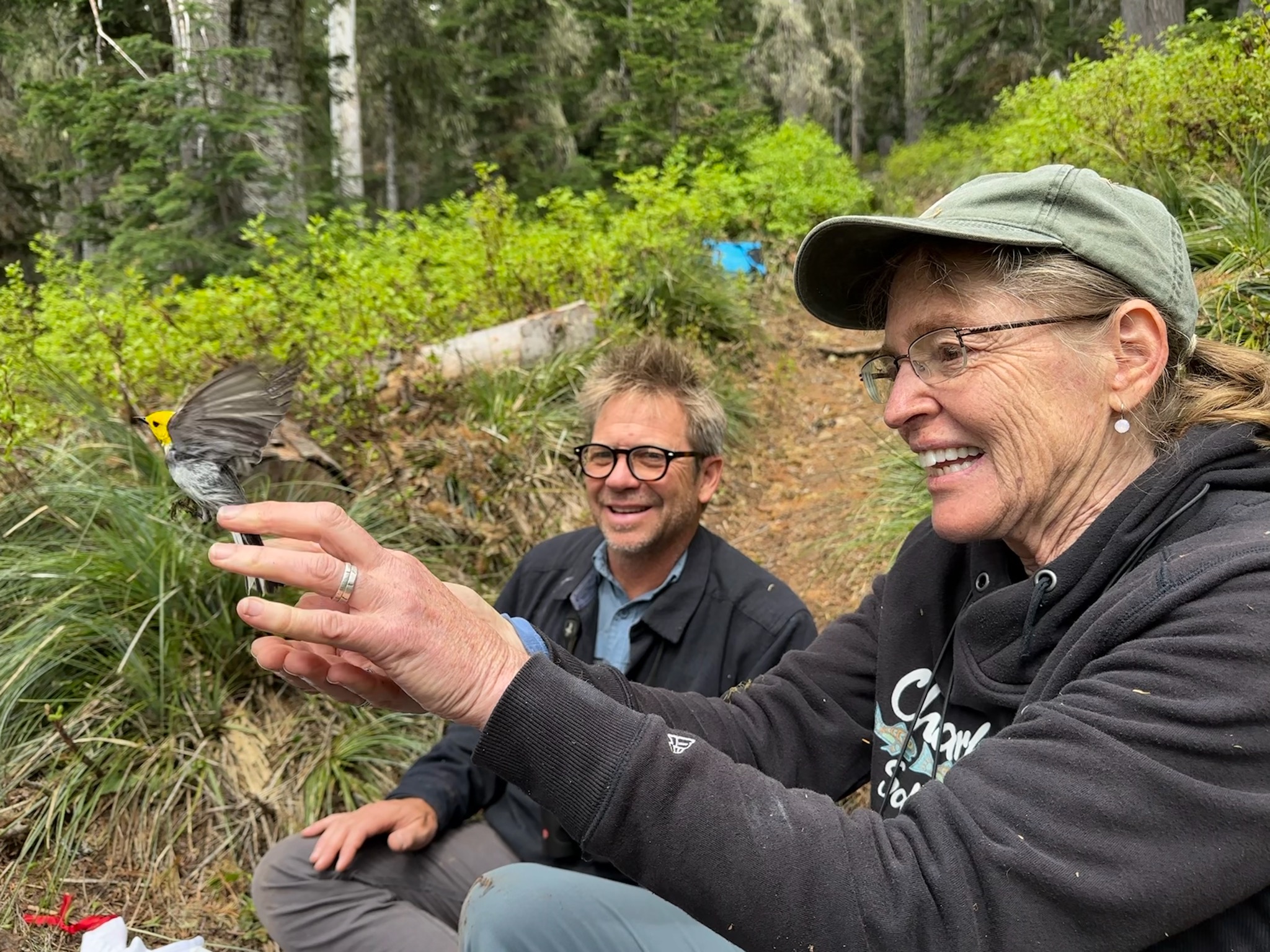 I’m holding a hermit warbler –my right hand cupped gently under the bird as my left forefinger and middle finger cradle his neck (the bird bander’s hold). The fine feathered warmth of his tiny body pulses with radiant life. I open my left hand and he rockets upwards in a dandelion-yellow and black fluff. Landing briefly on a nearby hemlock branch, he wings into the shadowy embrace of trees rooted in place for centuries.