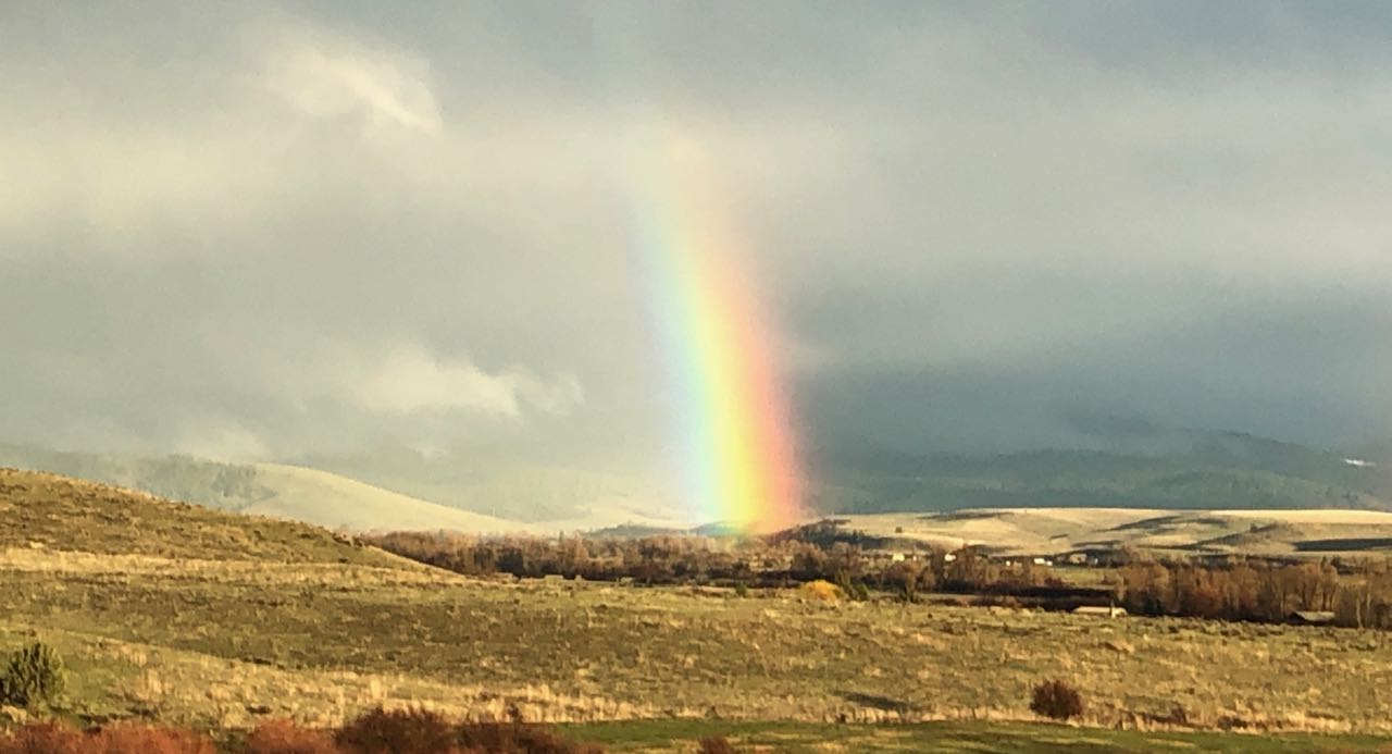 That’s when another facet of wild sunlight dazzles its jeweled self.   The air fills with raindrops. The sunlight reflects and refracts and reveals its wildest self in the rainbow on the other side of Prairie City.