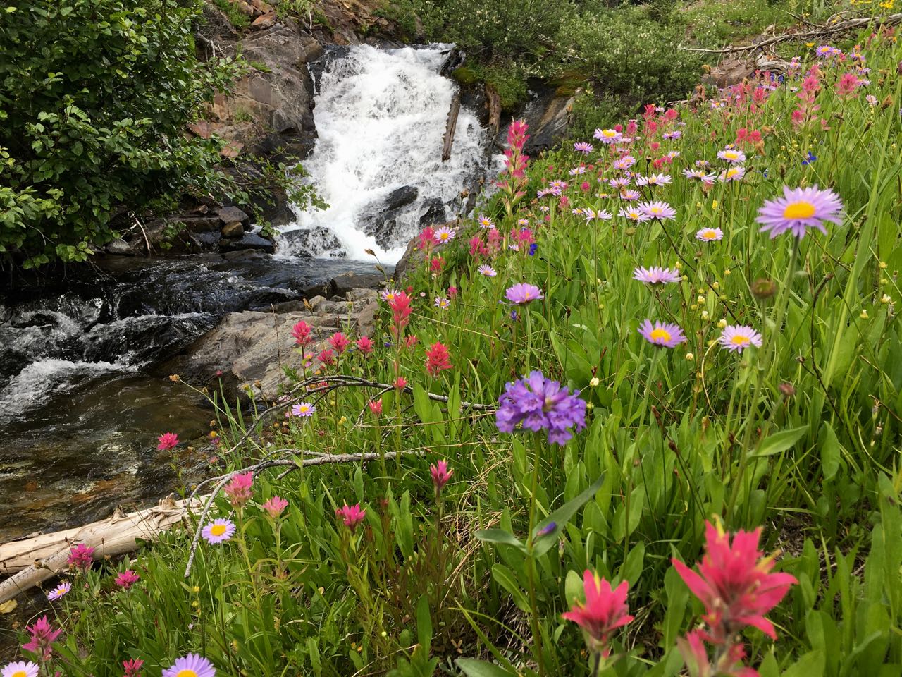 Flood alert in the high Wallowas! Wildflowers are surging, overflowing meadows, and crushing the headwater springs with their weight of beauty. Fueled by  snowmelt from the big winter, they jostle, tumble, and flourish.  Butterflies kiss their petals. Bees bury deep into their pollen-filled hearts. Hummingbirds sip their nectar.