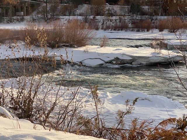 The opening scene is from the Clark Fork River flowing through downtown, where each brief day is a dance of lowering and rising clouds, draping mists, and Ansel Adams-worthy sunlight upon Mt. Sentinel, Mt. Jumbo, and the Rattlesnake Wilderness. There, I’d hoped to glimpse of a male kingfisher as I have so many times before. Most females fly south in winter from Montana–flashing their cinnamony red belts along waterways. Males may gravitate from creeks to larger rivers for ice-free fishing, while remaining vigilant and territorial.